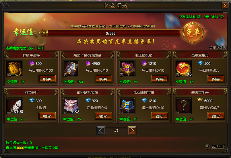 活动期间,每充值一定元宝可以增加一次幸运商城礼包购买次数