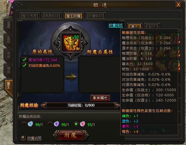 重生装备等级越高,可附魔的词条数量越多,词条种类越多,词条属性值越高